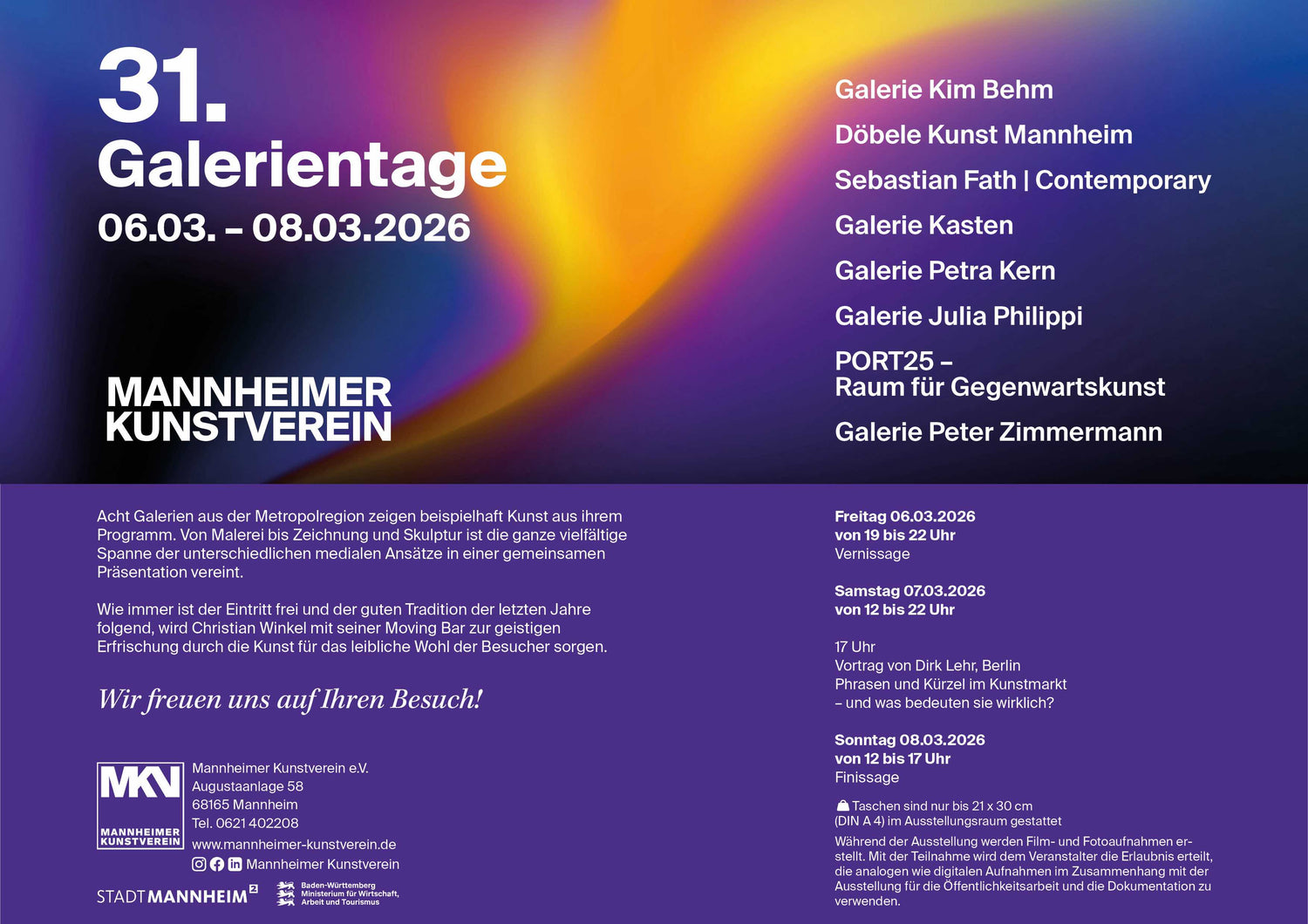 Schon heute möchten wir zu den 31. Galerientagen im Mannheimer Kunstverein vom 6. bis 8. März 2026 einladen.